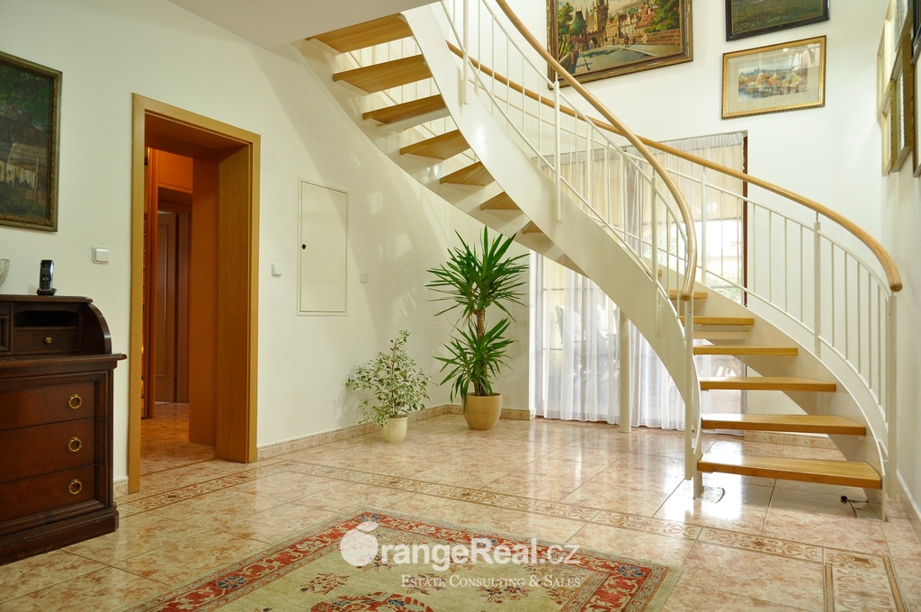 Výhradně nabízíme k prodeji krásný rodinný dům v lokalitě Jesenice - Horní Jirčany. Dispozičně 8+1, o užitné ploše 334m2 + bazén 32m2 a terasa 44m2. Dům se nachází na pozemku o výměře 1.111m2, v bonitní a vyhledávané lokalitě. Dům sestává v I. NP ze zádveří /dveřmi propojené s garáží/ navazující na prostornou halu, z které je v pravém křídle domu přístup do kuchyně s jídelním zázemím a obývacího pokoje se vstupem do realxační bazénové místnosti /bazén, sauna, sprcha/, prosklenými dveřmi a okny opticky propojené se zahradou. Bazén je celoročně uživatelný, vyhřívaný. Obývacímu prostoru dominuje krb s krbovou vložkou, z místnosti lze vstoupit na prostorově velkorysou terasu s krytou částí. Ze vstupní haly lze dále projít do levého křídla domu, kde nalezneme koupelnu s toaletou, ložnici, šatnu a pracovnu. Po točitém schodišti se vystoupá do II. NP, které sestává z haly, šatny, komory, dalších čtyřech obytných místností, technického zázemí domu, koupelny a samostatné toalety. Vytápění domu, bazénu a ohřev TUV zajišťují 2 plynové kondenzační kotle, v I. NP podlahové topení, ve II. NP radiátory. Dům se nachází v přírodní lokalitě, ovšem v blízkosti hlavního města Prahy. Doprava do ZŠ školní bus zajištěný obcí. 8min Canadian scholl, MŠ i anglická, ZUŠ, golfové hřiště. Obchodní možnosti v místě, dále OC Průhonice, Chodov. Doplňující informace u obchodníka společnosti. Doporučujeme navštívit virtuální prohlídku na web stránkách naší společnosti.